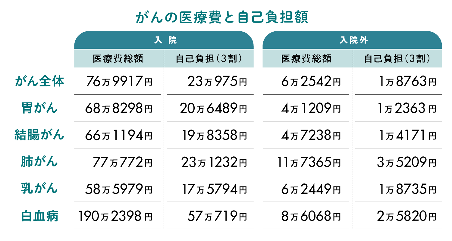 厚労省の統計によると、がんで入院した場合の1件あたりの平均医療費(※)は約77万円。通院(外来)などの入院外で約6万3000円になります。がんの種類によって治療にかかる費用には幅があり、胃がんだと入院が約69万円で、入院外が約4万円。女性に最も多い乳がんは入院約59万円、入院外が約6万円。血液のがんである白血病に罹患すると、がん全体の2倍以上の費用がかかることがわかります。
