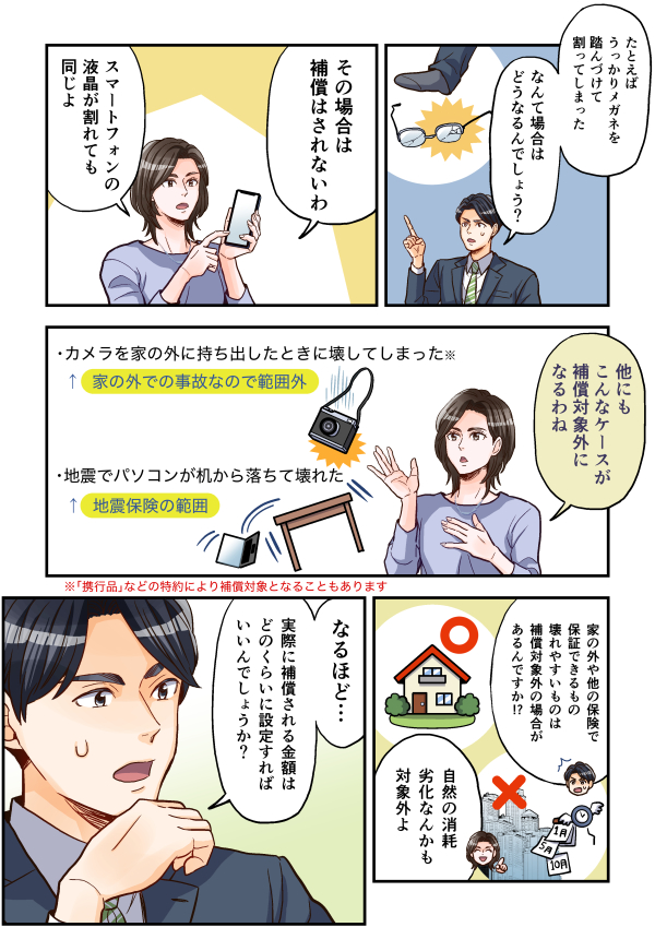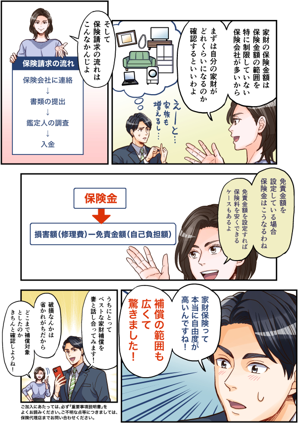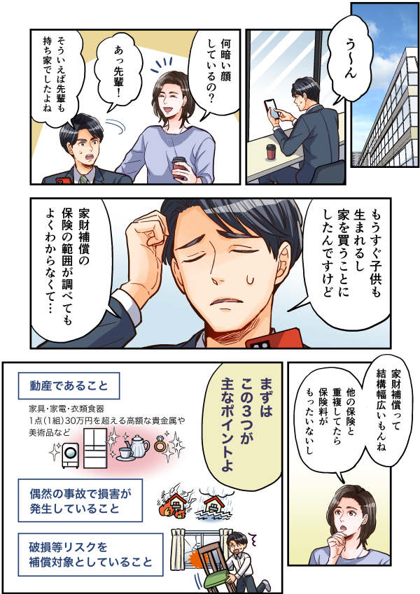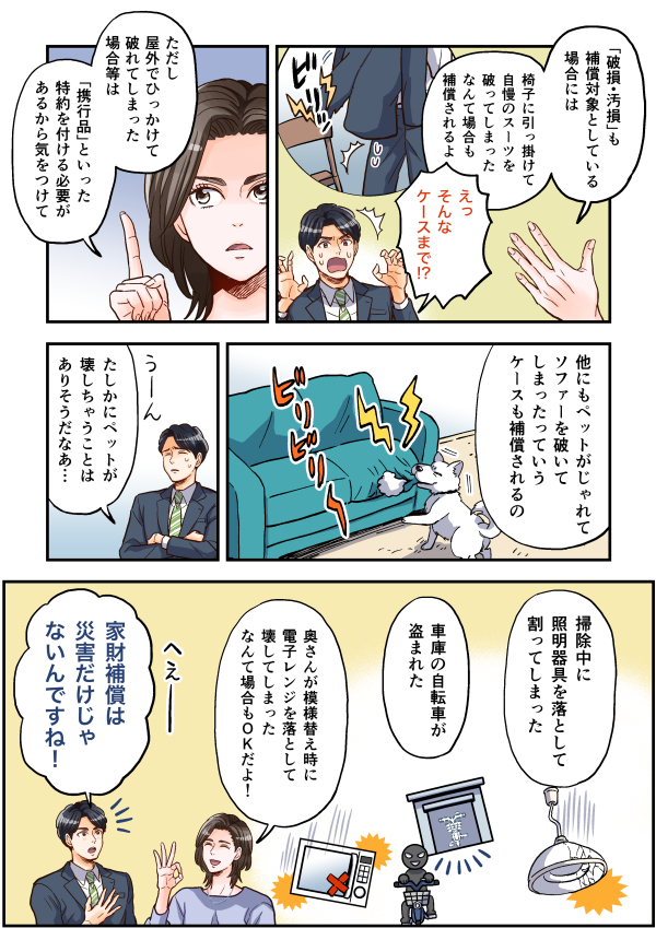 この漫画は、火災保険の家財補償についてのお話です。