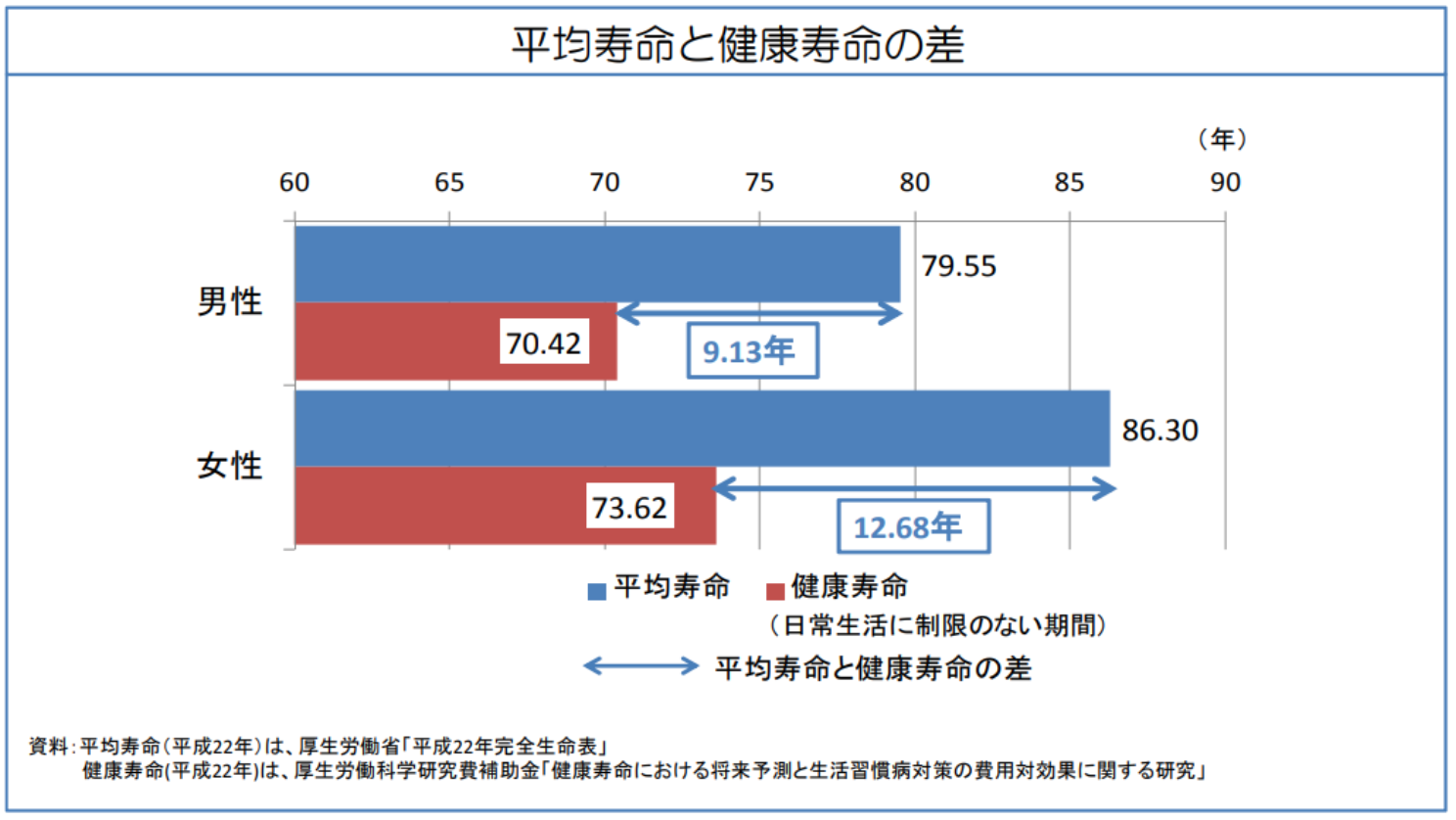 すでに述べたように日本人の平均寿命は延びています。しかし、健康で日常生活に制限のない日々が寿命どおりに続くとは限りません。厚生労働省によれば、平均寿命に対して日常制限のない健康寿命の差が男性で9.13年、女性で12.68年となっています。