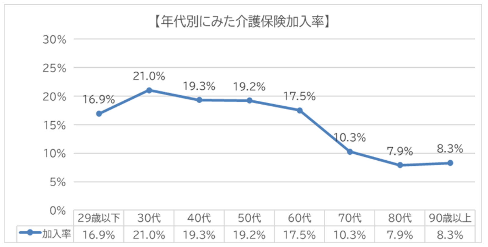 「生命保険に関する全国実態調査(生命保険文化センター2021年度)」のデータを参考に、各年代の民間介護保険加入率をみてみましょう。介護に対する不安の高まりから関心の高さが読み取れます。