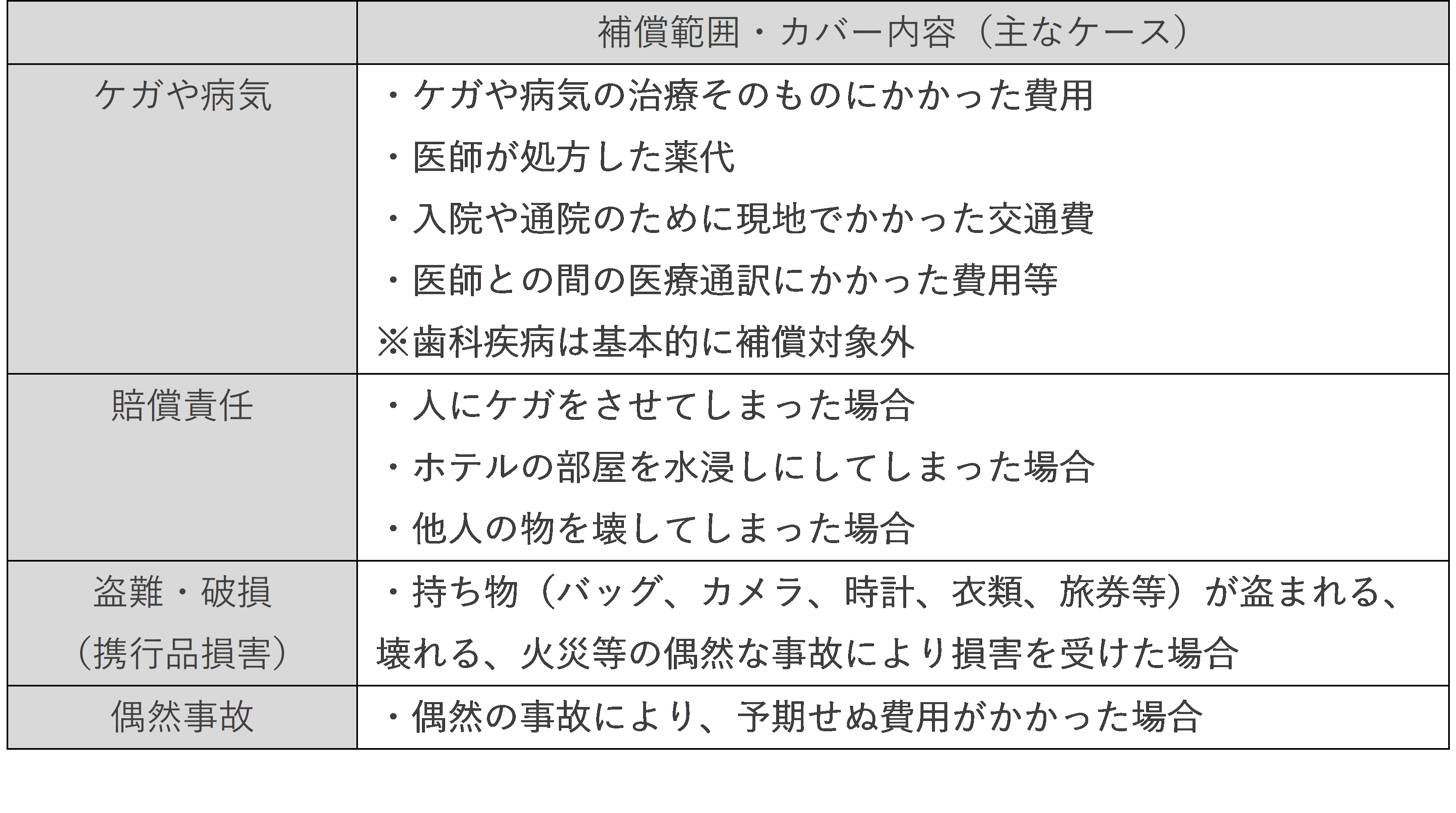 - 海外旅行保険の補償範囲はケガ・病気、賠償責任、盗難・携行品損害、偶然事故